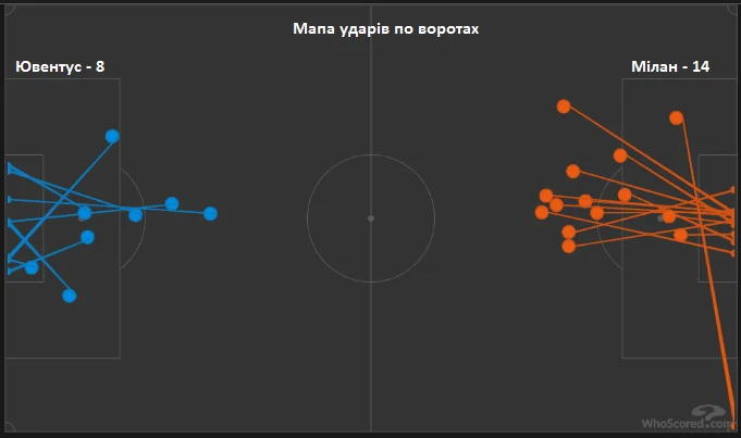 Мілан майже вдвічі перебив Ювентус, хоча більша кількість ударів "россонері" відбувалася з-за меж штрафного. До речі, Ібрагімовіч зі своїми зміщеннями у глибину за 28 хвилин, поки не був замінений, не завдав жодного удару. Жиру, який його замінив, виконував функції класичної дев'ятки і встиг завдати три постріли. Чемпіон світу неодноразово вигравав повітря у штрафному, але одного разу не зумів пробити воротаря, а двічі замість удару з вигідної позиції намагався скидати м'яч на партнерів, які вчасно не реагували. Також у складі Мілана по три удари на свій рахунок записали Леау та Ернандес.