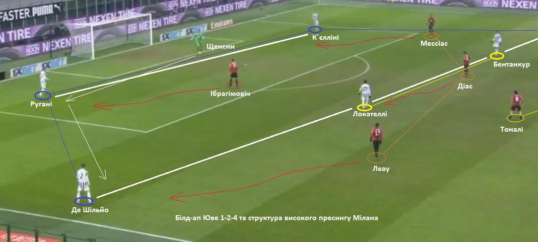 Ювентус намагався розігрувати м'яч від воріт, але суперники максимально ускладнювали їм взаємодії у фазі побудови позиційних атак. Зберігаючи структуру 4-2-3-1, Мілан провокував Ювентус вести м'яч через фланги, а потім активувалася флангова пастка. Златан, згодом Жиру, йшли на крайнього центрбека, перекриваючи вектор на другого центрального захисника. Вінгер атакував фулбека, а Діас і дальній вінгер закривали суперників у центрі поля.
