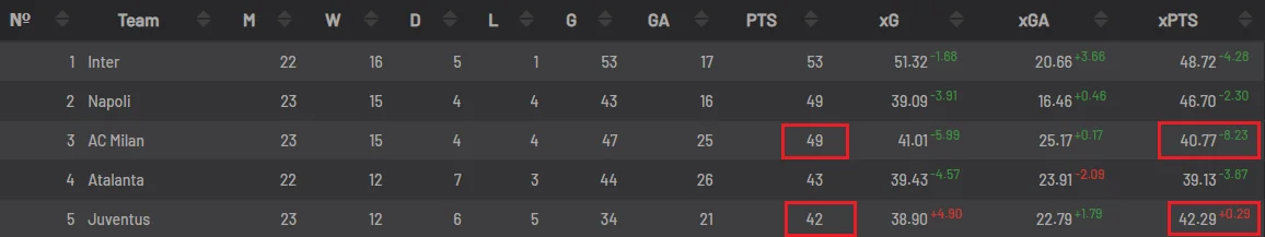 Наприкінці погляньте на показники очікуваних очок (xPTS) у Мілана і у його конкурентів. Вони суттєво контрастують з реальним доробком. Думаю, якщо команда не додасть у якості гри, то може мати серйозні проблеми не тільки у боротьбі за чемпіонство, а й за місце у заповітній четвірці. Пауза у сезоні зараз потрібна і Мілану, і Ювентусу.