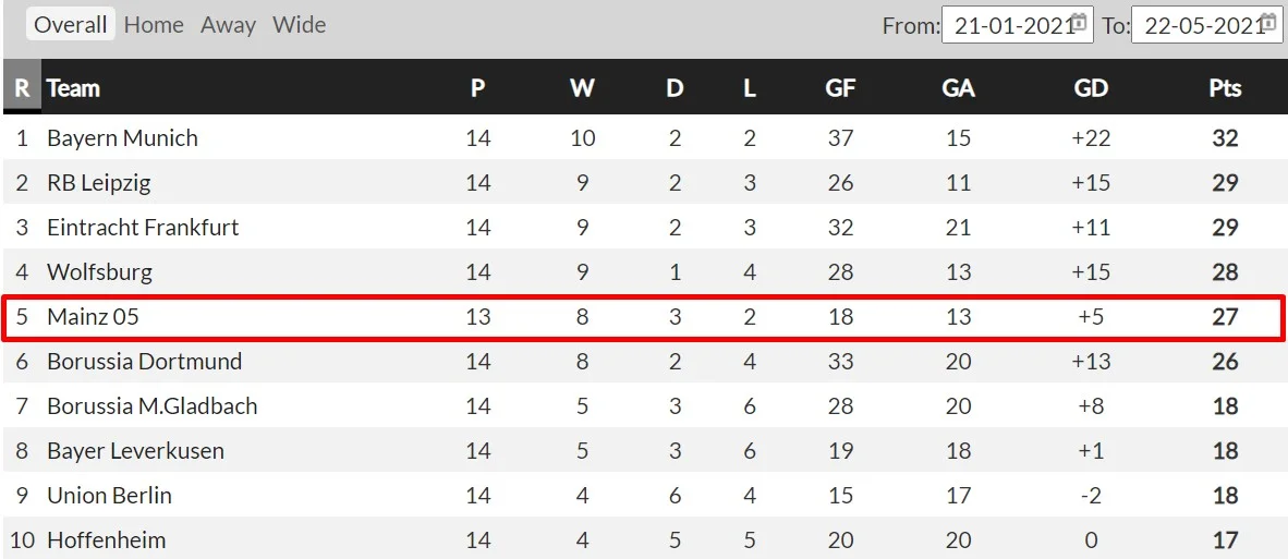 Результати неймовірно покращилися, Майнц рвонув вгору по турнірній таблиці. У другому колі чемпіонату команда виграла 8 матчів з 13 і набрала 27 очок – це п'ятий показник Бундесліги, навіть Дортмунд виступає гірше.