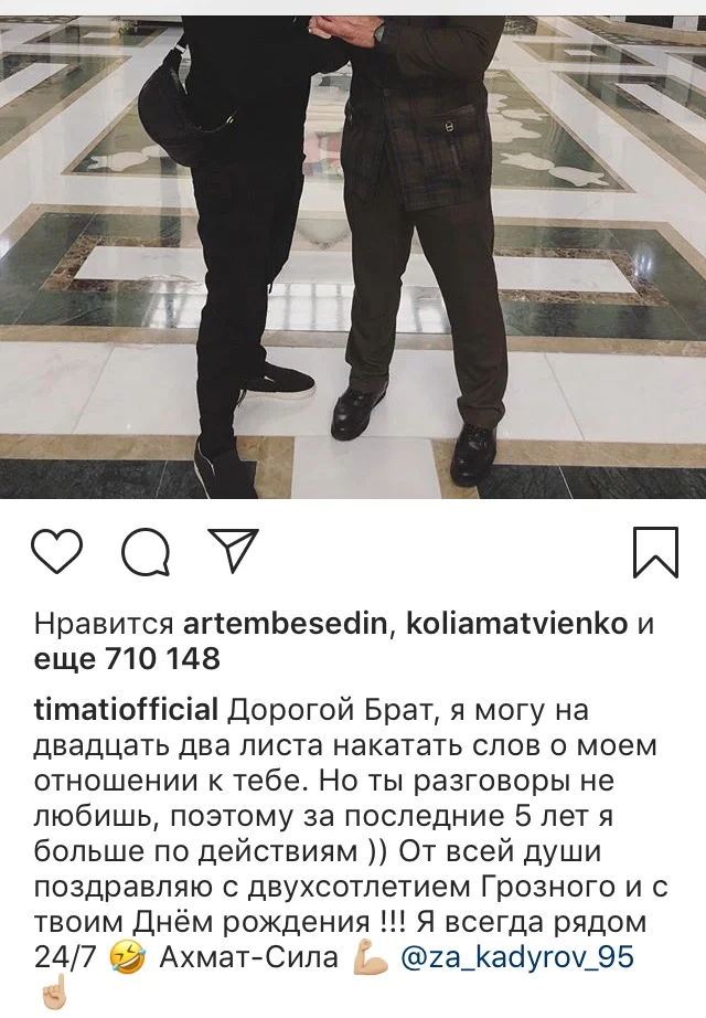 Денис Попов, Микита Шевченко, Віталій Віценець та Ахмед Алібеков "привітали" з Днем народження голову Чеченської Республіки Рамзана Кадирова разом з Тіматі.