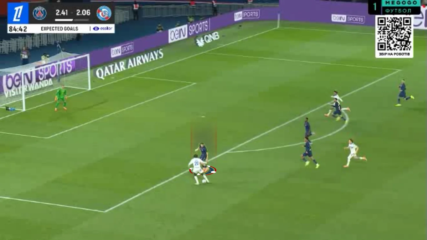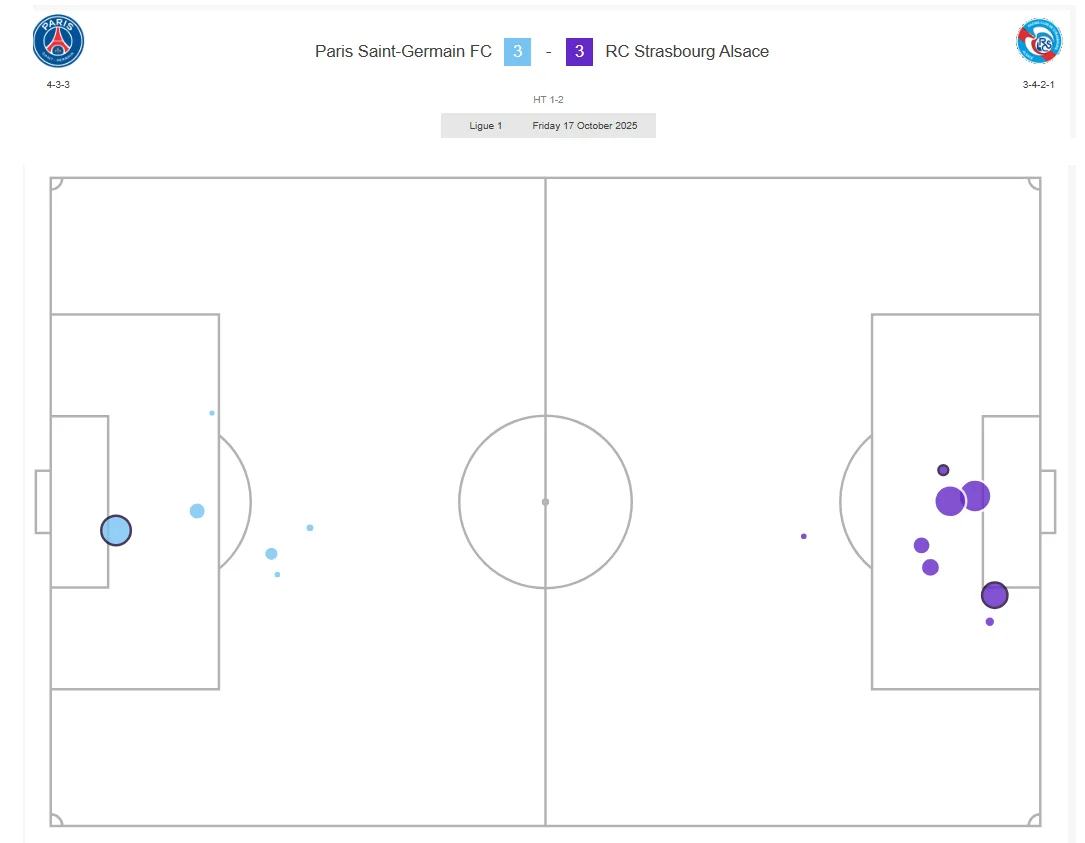 Виходить, що перший тайм проти Страсбура був не таким вже й жахливим на тлі попередніх, однак парижани набагато більше дозволяли біля власних воріт. Ельзасці дуже сміливо пресингували (це їхній звичний стиль), зробили 12 дотиків у карному майданчику, 8 ударів, 2 голи й 1,38 xG. Їхню агресію до перерви яскраво демонструє трекер очікуваної гостроти.