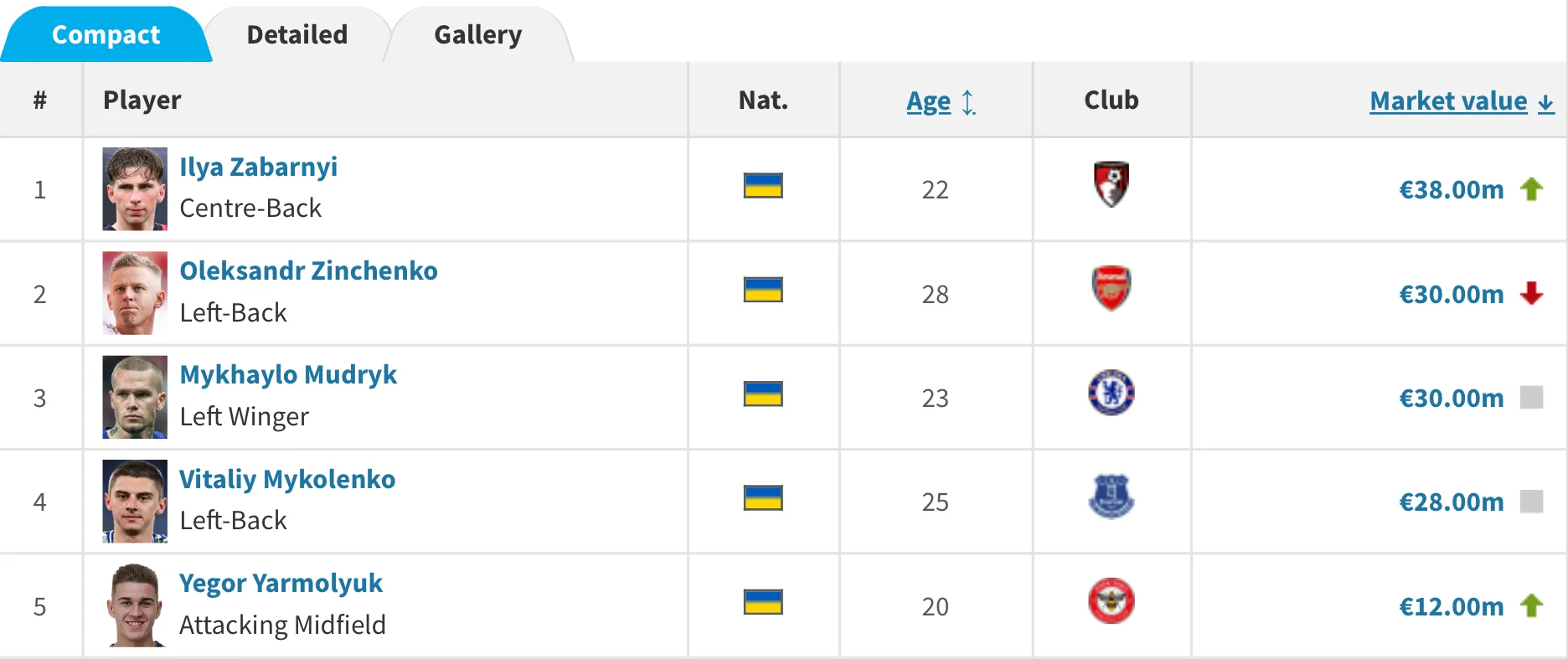 Найвищу оцінку серед українців отримав захисник Борнмута Ілля Забарний, чия вартість зросла на 6 мільйонів євро і тепер становить 38 мільйонів. Олександр Зінченко з Арсенала подешевшав на 5 мільйонів, його поточна вартість – 30 мільйонів євро.