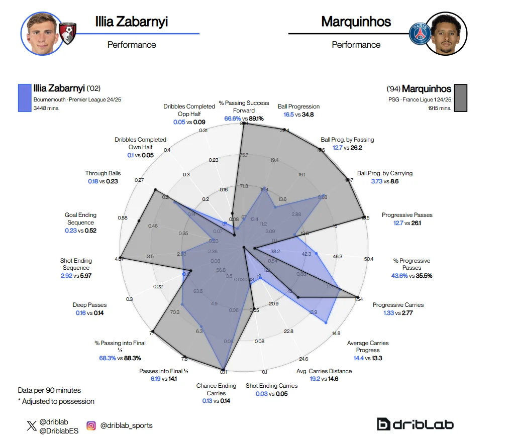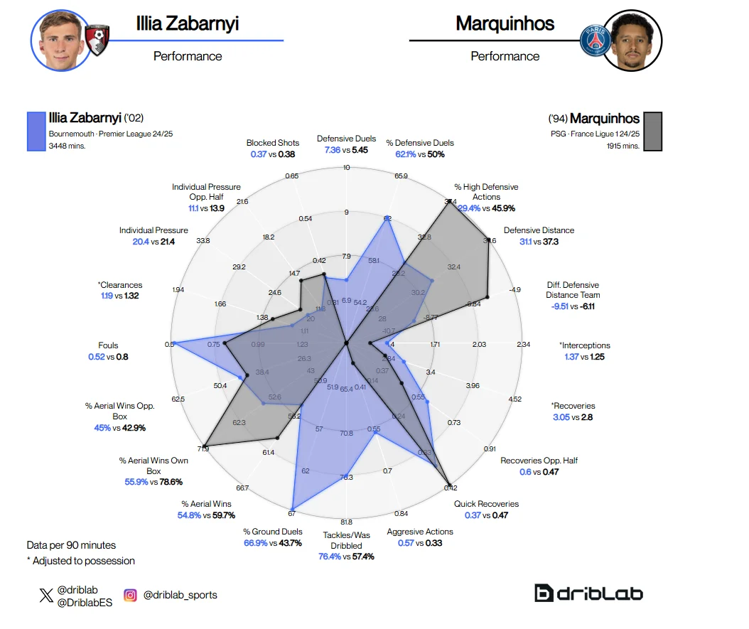 У французькому чемпіонаті є не так багато команд, які здатні зменшити перевагу ПСЖ у володінні, а парижани не так багато допускають моментів біля своїх воріт. Пачо видав досить непоганий сезон 2024/25, але він не завжди діє бездоганно. Забарний стабільніший у своїх виступах, ніж еквадорець. Попри те, що в обох є свої сильні сторони, два гравці досить схожі за стилем. Як і Забарний, Пачо класно оцінює епізоди, що дає йому можливість вибирати правильне позиціювання, досить агресивний і теж класно грає в єдиноборствах.
