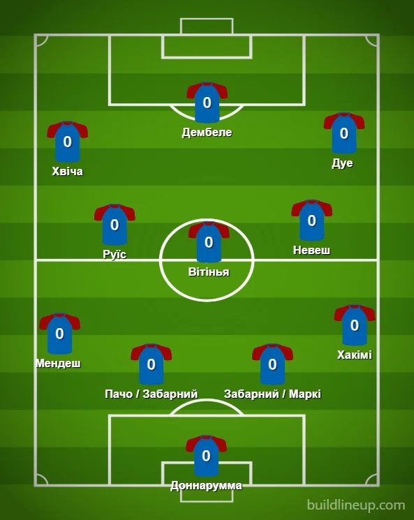 Подивимося, як би виглядав склад ПСЖ з українцем. Схема, яку найчастіше використовував Луїс Енріке в кампанії 2024/25 – 4-3-3. У цій системі Забарного можна уявити як на місці Маркіньйоса, так і на місці Пачо.