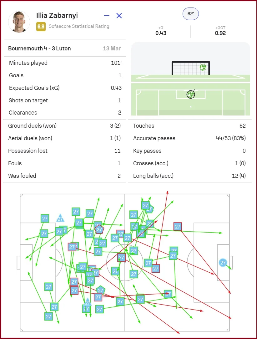 Українець підключився на кутовий та головою заштовхнув м'яч у ворота (Дауті відчайдушно кидався на лінії, проте все ж спізнився на мить). Забарний чекав цього моменту понад рік і 33 матчі у найсильнішій лізі світу. Це взагалі його перша результативна дія за Борнмут!