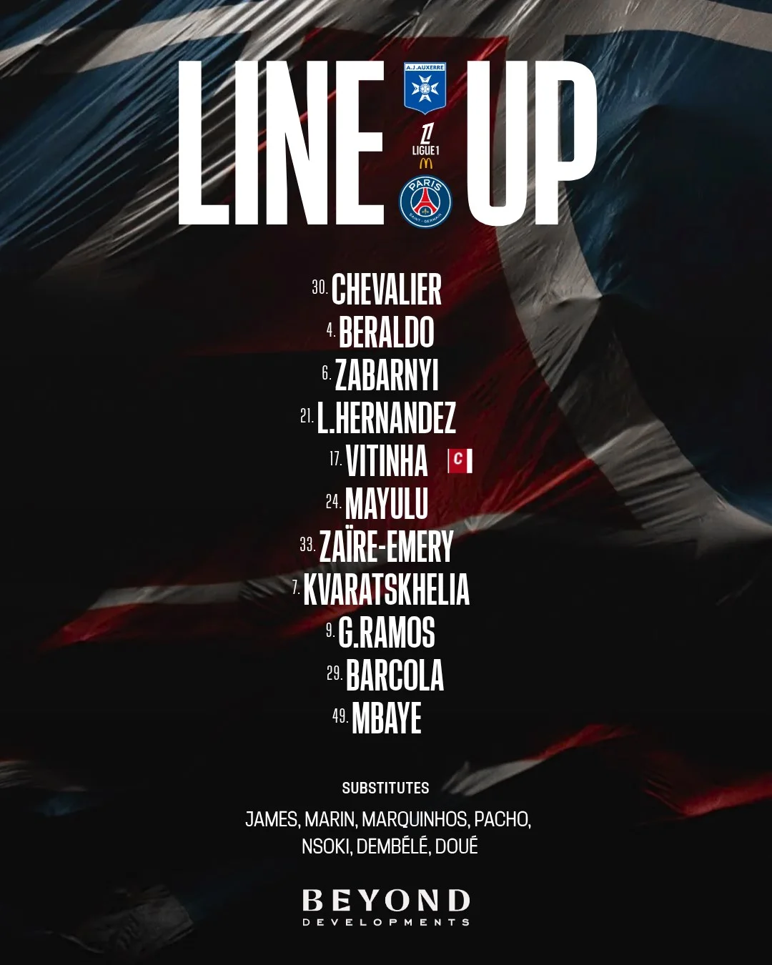 Стартовий склад ПСЖ: Шевальє – Заїр-Емері, Забарний, Беральдо, Лукас Ернандес – Мбайє, Вітінья (к), Маюлю – Барколя, Рамуш, Кварацхелія.