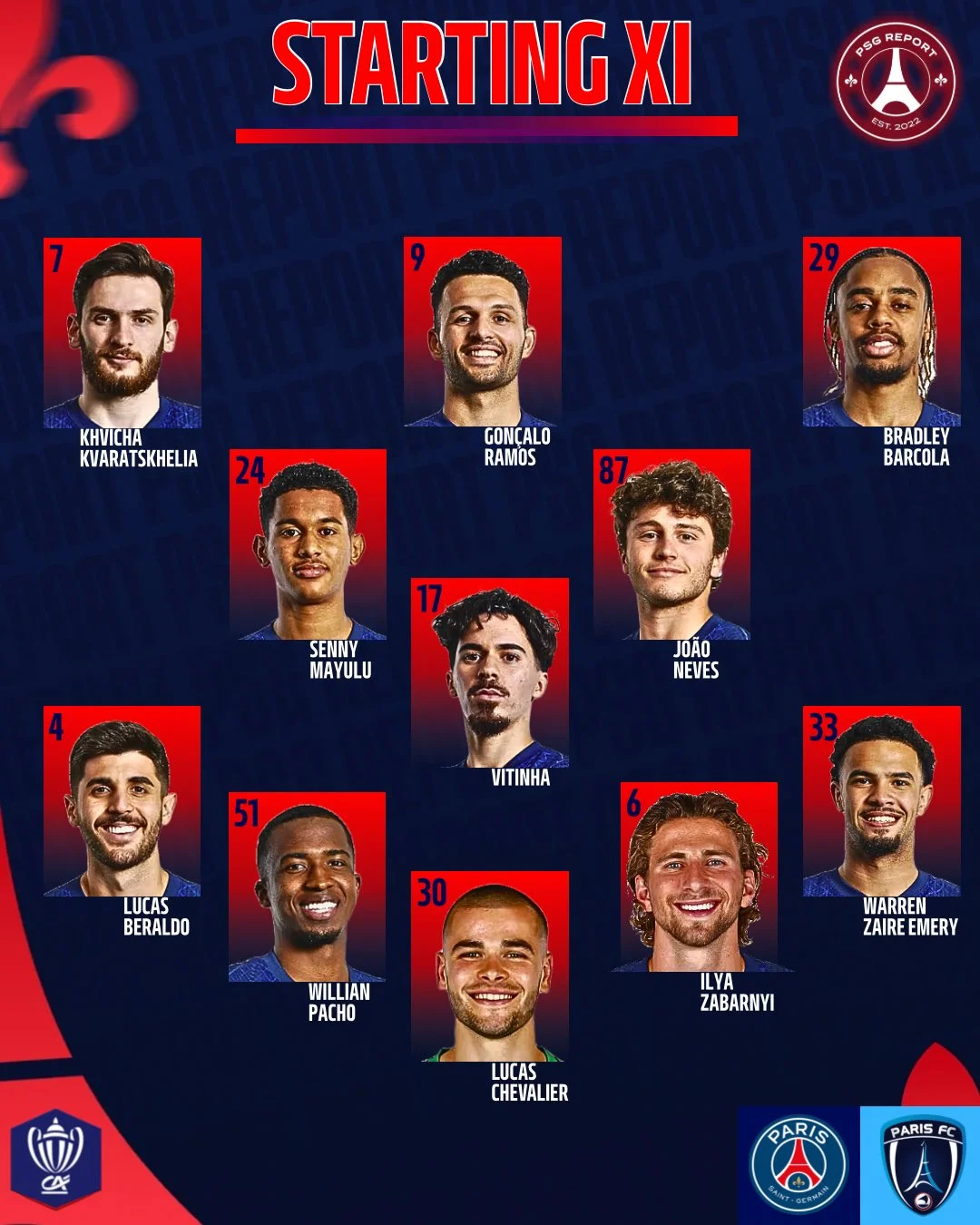 Стартовий склад ПСЖ: Шевальє – Беральдо, Пачо, Забарний, Заїр-Емері – Маюлю, Вітінья (к), Невеш – Кварацхелія, Рамуш, Барколя.