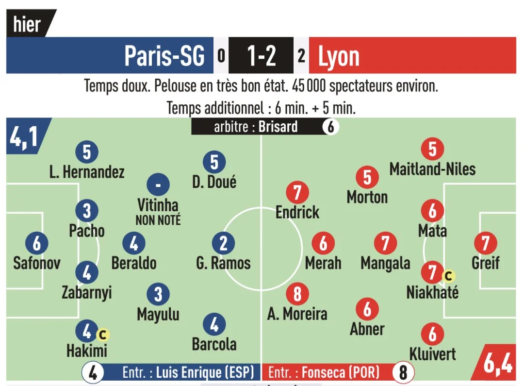 Видання L`Equipe виставило оцінки усім гравцям матчу ПСЖ – Ліон. Найкращим визнали нападника "ткачів" Афонсу Морейру – 8 балів, тоді як у парижан найвищу оцінку отримав росіянин Матвій Сафонов (6).
