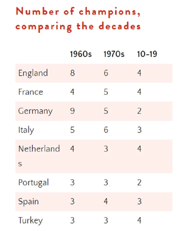 Загалом, у всіх країнах кількість чемпіонів зменшилася. Наприклад, у 1960-х роках в Англії було вісім чемпіонів, а в 1970-х – шість. За останні 10 років їх було лише чотири (Челсі, Лестер і два манчестерські гранди). Те ж саме відбувається практично у всіх чемпіонатах – навіть в Іспанії, де в 1970-х роках було чотири чемпіони, за останні 10 років Прімеру вигравали лише Барселона, Реал і Атлетіко. В Німеччині ситуація ще гірша. Якщо в 60-х було 9 різних переможців, то зараз Баварії лише іноді може завадити дортмундська Борусія. Вперто протистоїть тенденції Туреччина, де в останнє десятиріччя компанію на вершині класичному тріо Бешикташ-Галатасарай-Фенербахче склав Бурсаспор, а якщо нинішній сезон вдасться дограти, цілком ймовірно, що там з'явиться ще одне нове ім'я – наразі в лідерах Трабзонспор та Башакшехір.