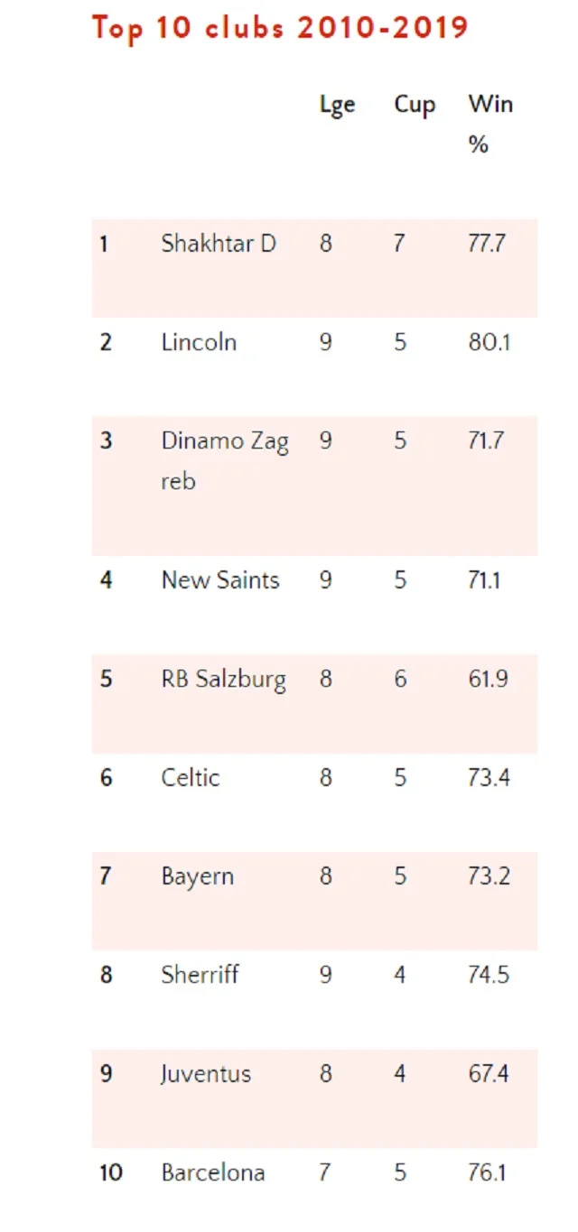 Слідом за Шахтарем розташувалися відразу три клуби з однаковими показниками – по 9 перемог у чемпіонаті плюс 5 здобутих Кубків. Йдеться про Лінкольн з Гібралтара, загребське Динамо та Нью Сейнтс (Уельс). У австрійського Зальцбурга тих таки 14 титулів, але з іншим розподілом (8 чемпіонств і 6 Кубків). Додамо, що за відсотком перемог Лінкольн єдиний у топ-10 зумів подолати межу у 80%. Лише у нижній частині таблиці ми бачимо топ-клуби. Баварія має ідентичні показники (8+5) з Селтіком українця Мар'яна Шведа, а Ювентус та Барселона пропустили вперед ще й молдавський Шериф.