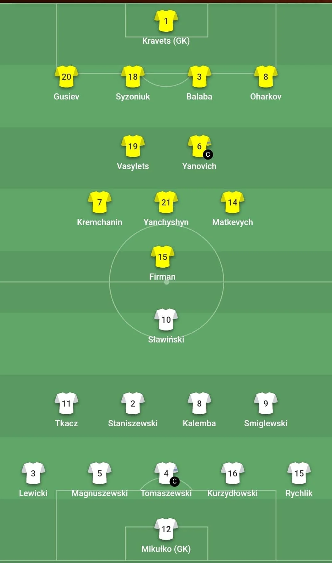 Натомість суперник свої нагоди використовував значно ефективніше. Ткач відкрив рахунок на 36-й, а вже у компенсований час до першого тайму подвоїв перевагу поляків Сміглевскі. 0:2 – холодний душ для команди Олега Кузнецова, який у перерві провів одразу 3 заміни. На полі з'явилися ще два представники Динамо, Дзень та Білоконь, а також "гірник" Деркач.