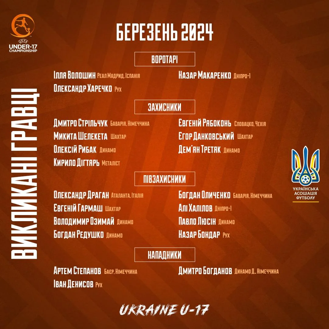 Збірна України U-17 оголосила заявку на матчі еліт-раунду кваліфікації Євро-2024 – виклик гравців Реала і Баварії