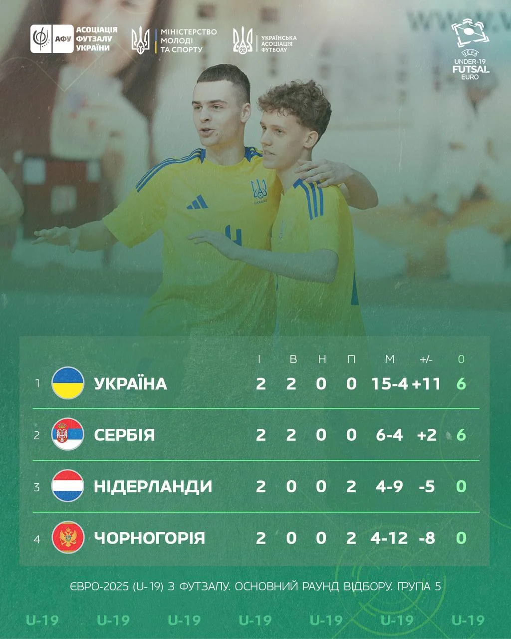 Футзальна збірна України U-19 перемогла однолітків з Нідерландів у кваліфікації на чемпіонат Європи (6:2).