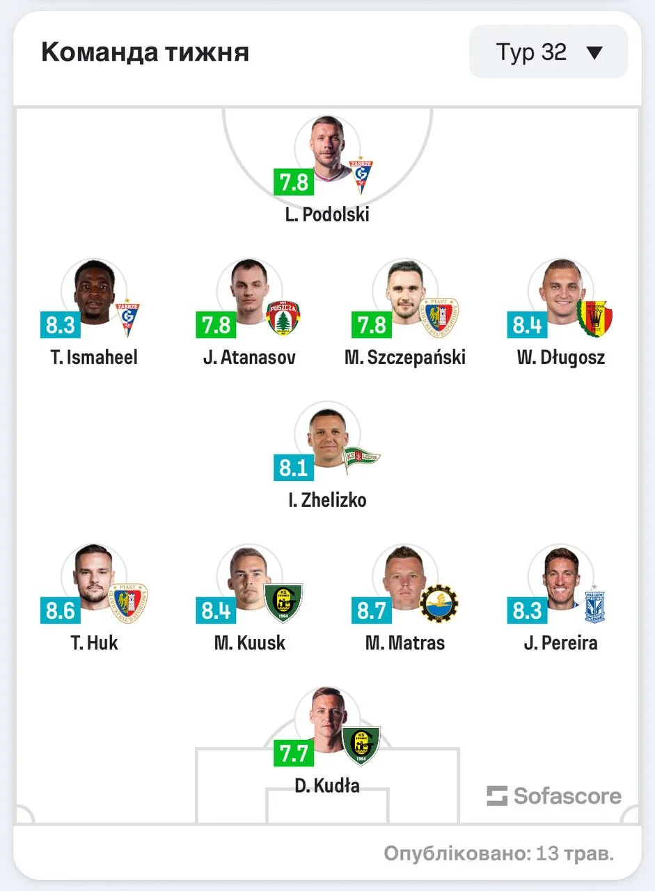 Півзахисник Лехії Іван Желізко опинився серед одинадцятки найкращих за підсумками 32-го туру чемпіонату Польщі.