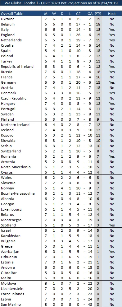 Ось так виглядають кошики станом на 15 жовтня 2019, згідно з розподілом команд у відборі Євро-2020. Україна, хоч і перебуває серед топ-6 сіяних, ризикує нарватися на таких суперників по групі смерті, як Іспанія або Франція з другого кошика, Німеччина чи Португалія з третього. Якщо раптом програємо сербам і конкуренти дружньо нас посунуть, тоді можемо зіграти, наприклад, проти Італії/Англії і тих же португальців чи німців.