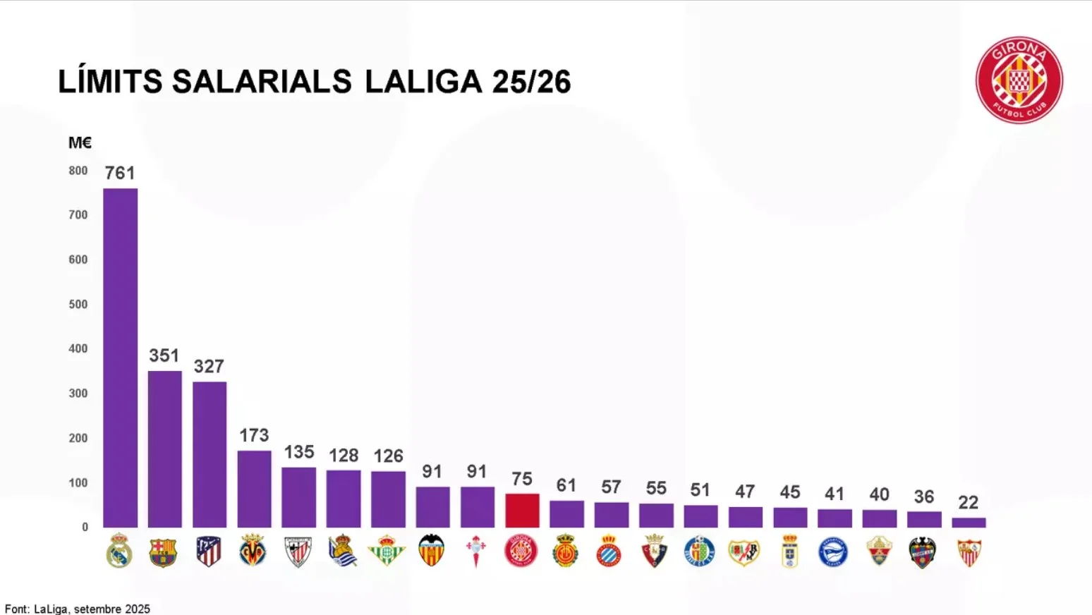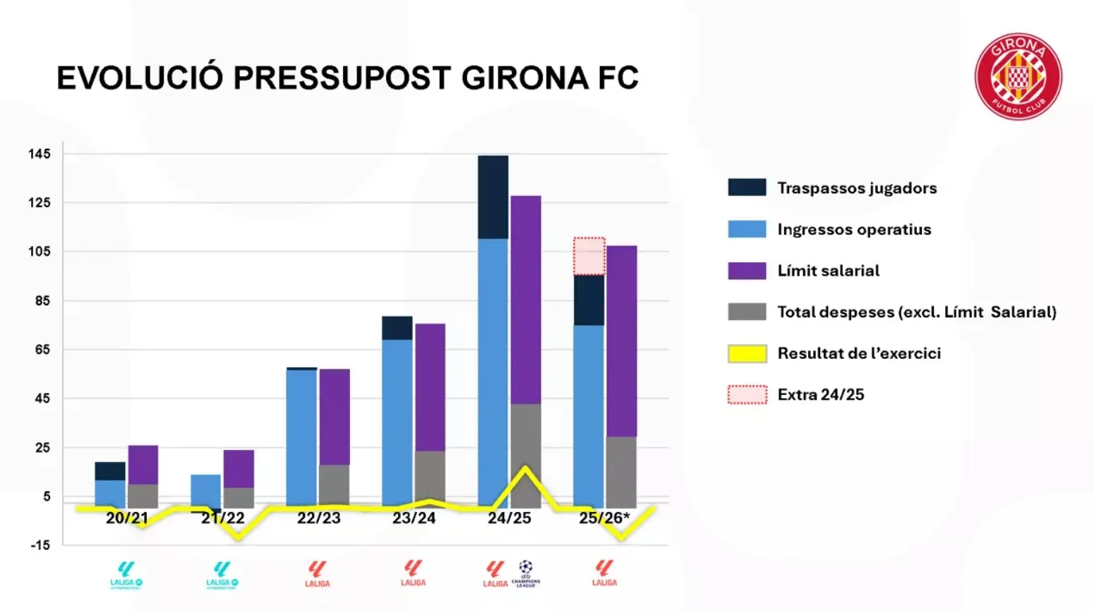 "Наші акціонери реінвестували доходи на полі. Щоб зменшити ризик вильоту, це зобов'язання було взято на себе. Поточна межа зарплат становить 75 мільйонів євро, але існує трирічний план, який контролює Ла Ліга. Акціонери хочуть реінвестувати прибуток у команду, щоб зменшити ризик вильоту до Сегунди", – наводить слова Мас-Баги офіційний сайт Жирони.
