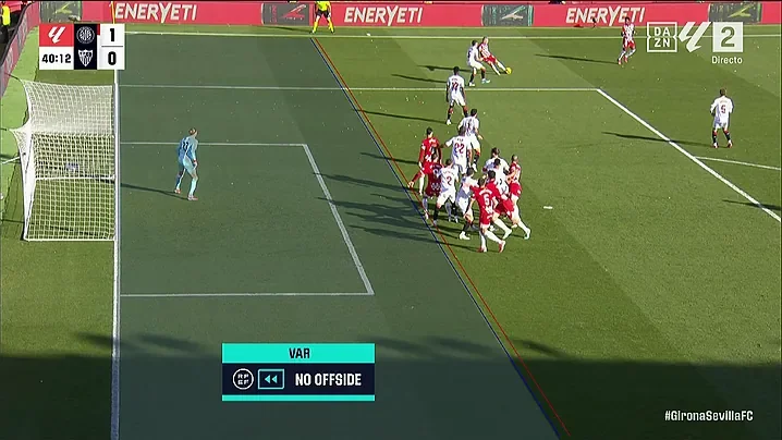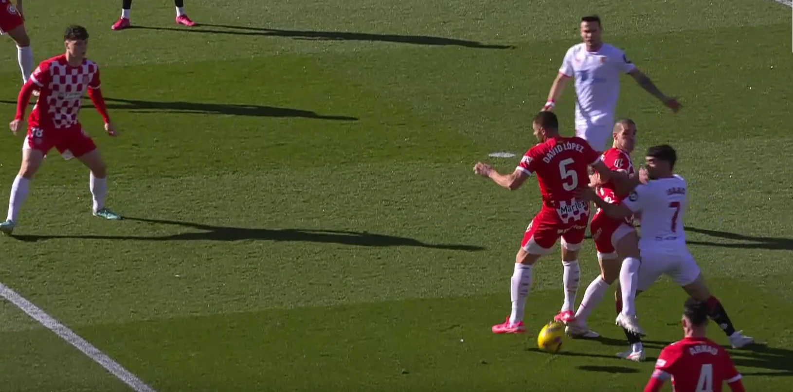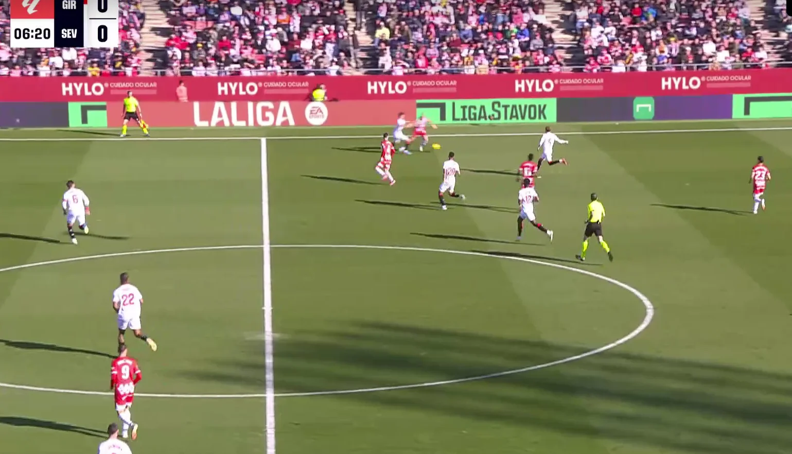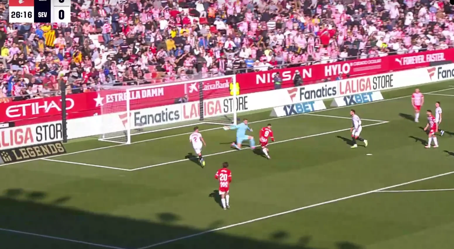 Люкебакіо у відповідь втратив фантастичний момент на 35-й хвилині. Педроса навісив зліва, Ромеро головою переправив на дальню стійку, а бельгійський вінгер, за яким не встежив Блінд, влупив у поперечку. Севілья миттєво поплатилась за марнотратство. Аспрілья розіграв кутовий з Циганковим, який подав на лінію воротарського. Арнау тонко підправив у сітку – 1:0. Другий асист для Віктора у сезоні та 15-й у Ла Лізі загалом. Востаннє він виконував результативні дії у чемпіонаті Іспанії ще в серпні (1+1 проти Осасуни). На перерву команди пішли за нелогічної переваги Жирони.