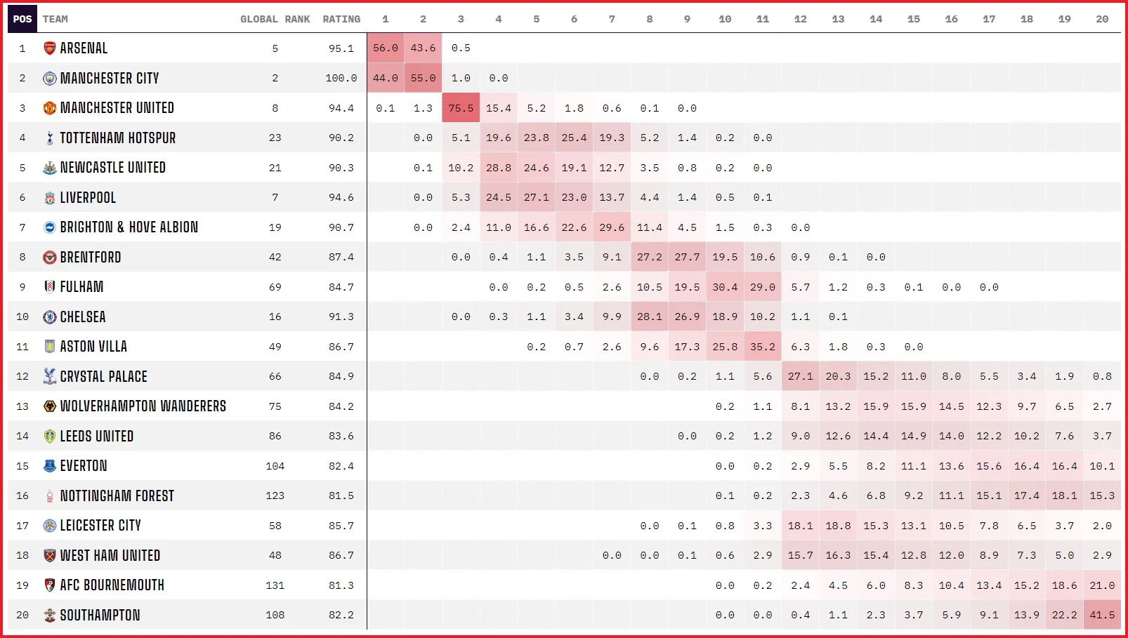 Але 70% дистанції позаду, а Арсенал на вершині АПЛ. З відривом від Манчестер Сіті у 8 очок (щоправда, лондонці зіграли на один матч більше). Аналітичні портали називають команду Артети фаворитом. FiveThirtyEight та OptaAnalyst дають аналогічну картину: 56% на чемпіонство Арсенала і 44% на Сіті.