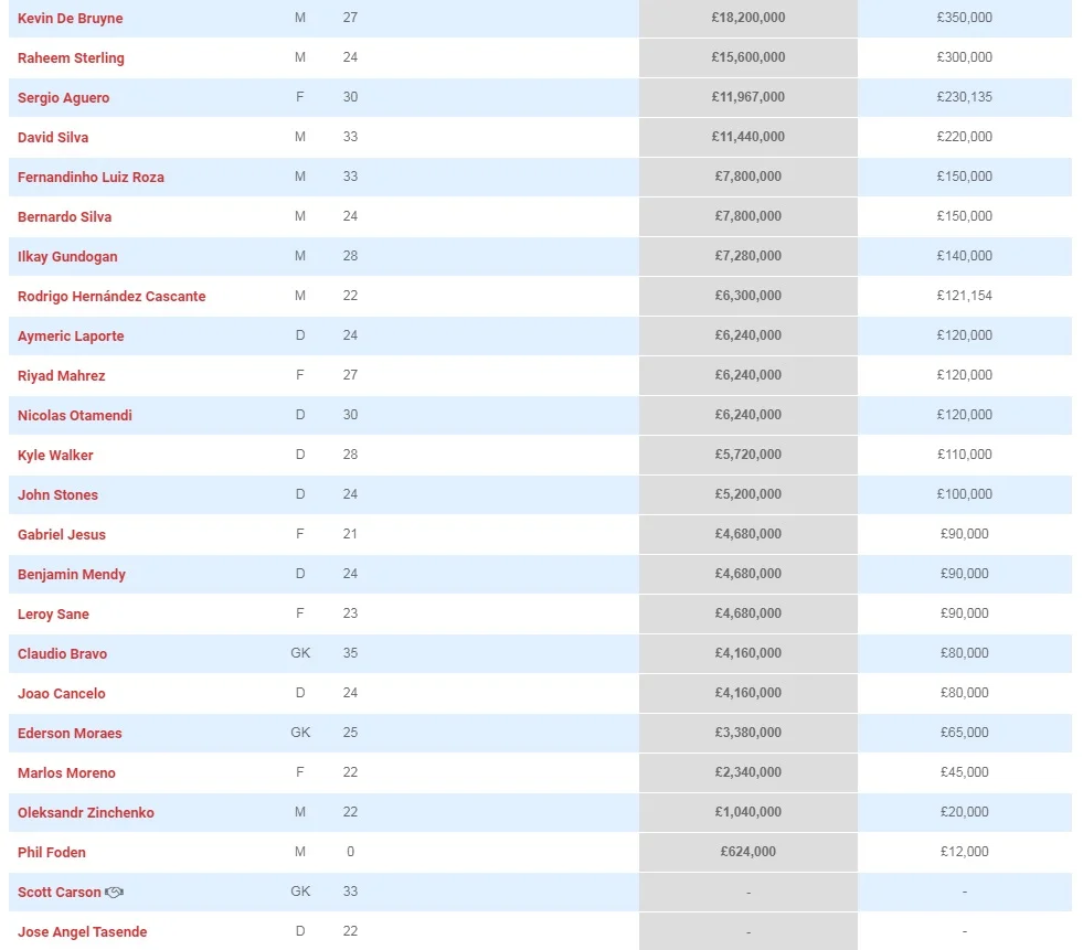 Найгрошовитішим у складі Манчестер Сіті є бельгійський півзахисник Кевін де Брейне, який щотижня отримує у клубній касі 350 тисяч фунтів. Другим у черзі за ним стоїть Рахім Стерлінг, який кладе до своєї кишені 300 тисяч фунтів. Замикає трійку товстосумів Серхіо Агуеро з тижневим окладом у 230,135 тисяч фунтів.