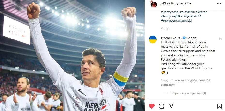 І вітаю вас із кваліфікацією на чемпіонаті світу", – написав Зінченко у коментарі до посту Лєвандовскі в Instagram.