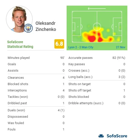 Зінченко отримує ігровий час через чергову травму основного лівого захисника Бенджаміна Менді. Авторитетні джерела навіть повідомили, що Хосепа Гвардіола не продасть його взимку. Однак свій шанс проти Ліона українець не використав.