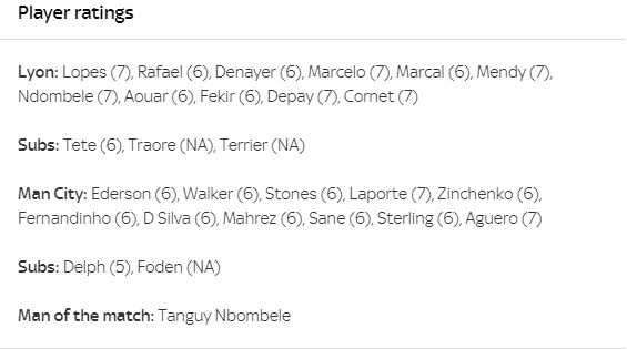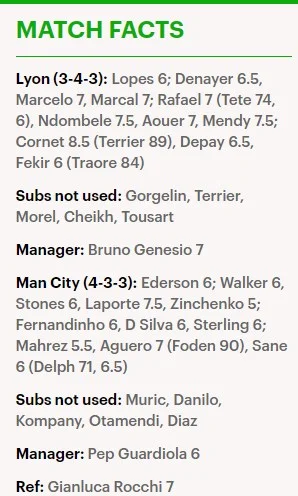 Manchester Evening News найгіршу оцінку приберегли для Лероя Сане (4) та Ріяда Мареза (5). Зінченко отримав нормальні 6 балів – знову ж середній результат. "Почувався значно комфортніше в другому таймі, коли Сіті в основному грав на половині поля Ліона. Однак із захисними обов'язками не впорався", – вважає журналіст MEN.