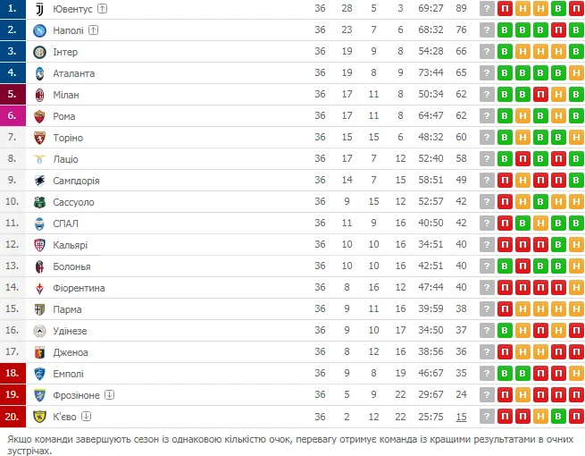Поки Ювентус та Наполі вже готуються до наступного сезону (туринці навіть встигли звільнити Аллегрі), Аталанта, Інтер, Мілан і Рома розіграють між собою ще дві путівки у Лігу чемпіонів. Сенсаційна команда з Бергамо, яка стала відкриттям сезону, наразі посідає третю сходинку, а у звітному турі пройде складне випробування "Старою Синьйорою". У першому колі Алехандаро Гомес та компанія зуміли відібрати у туринців очки (2:2), тож чому б їм ще раз не повторити маленький подвиг? Тим паче, що Аталанту зараз підтримує майже вся Європа.