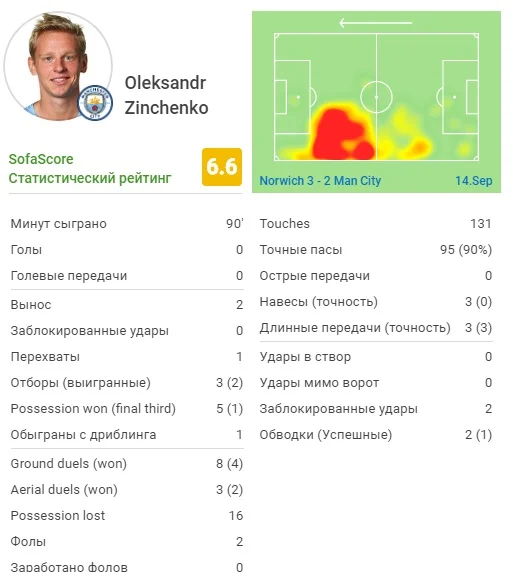 Зінченко знову продемонстрував хороший відсоток точності передач (95%), але здебільшого грав через ближнього, що не сильно допомагало команді Гвардіоли, яка намагалась створити камбек по ходу другого тайму. Фактично, наш футболіст підписав собі вирок, не здійснивши жодного гострого пасу. З навісами також виникли серйозні проблеми – усі три спроби виявились невдалими. Про удари, як ви вже встигли здогадатись, навіть не йшла мова. Аналітичний портал SofaScore оцінив роботу Олександра на 6.6 з 10-ти, проте відразу шість його партнерів (Едерсон, Отаменді, Стоунз, Вокер, Сілва, Агуеро) отримали ще нижчі оцінки. Популярний WhoScored також вважає Зінченка далеко не найбільшим лузером – аналогічний бал та "золота середина" у команді, з тією різницею, що Гюндоган замінив Агуеро серед головних невдах.
