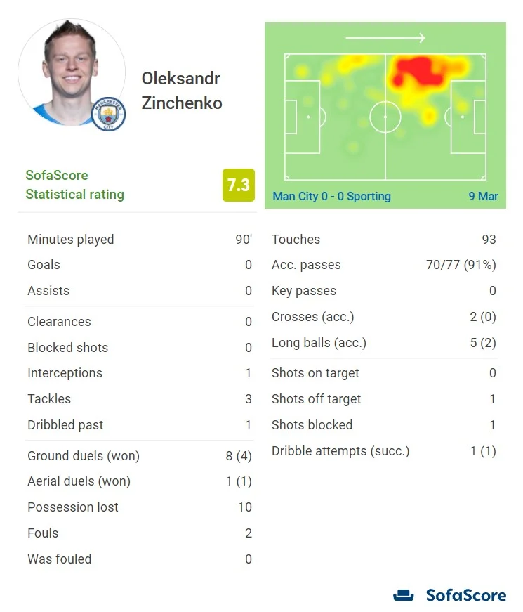 Олександр вийшов на лівий фланг оборони і зіграв у звичному для себе стилі. Українець часто зміщувався в центр, залишаючи фланг для Стерлінга та Гюндогана. Брав активну участь в атаках, намагався загострювати дальніми передачами. Спершу всі вони летіли в молоко, але потім Зінченко вирізав шикарну діагональ на Мареза, яка призвела до незарахованого гола.