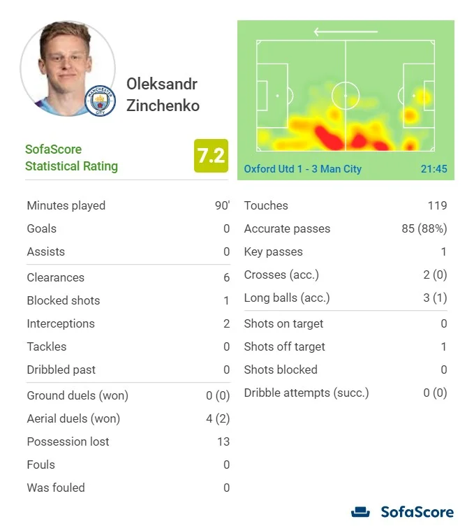У другому таймі Зінченку довелося чимало відпрацьовувати на оборону. Оксфорд тиснув, а нашому земляку було складно. 6 виносів, 3 блоки, 2 перехоплення, 2 виграні верхові дуелі з 4 – це добре. Але в Олекса були проблеми – він губив своїх опонентів. Зокрема втрачений ним Сайкс розстрілював Браво впритул. Помилка, яка дивом не стала гольовою. Сьогодні Зінченко не переконав, що він має бути першим вибором Гвардіоли на лівий фланг оборони.