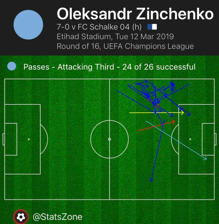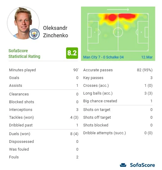 Такі цифри підтверджують загальне приємне враження від його дій в захисті проти Шальке. Так, суперник був "мертвий", але не в останню чергу завдяки грамотному контрпресингу та перекриванню зон Зінченком і іншими "містянами". Олександр заслужив виключно оплески та місце в старті після міжнародної перерви.