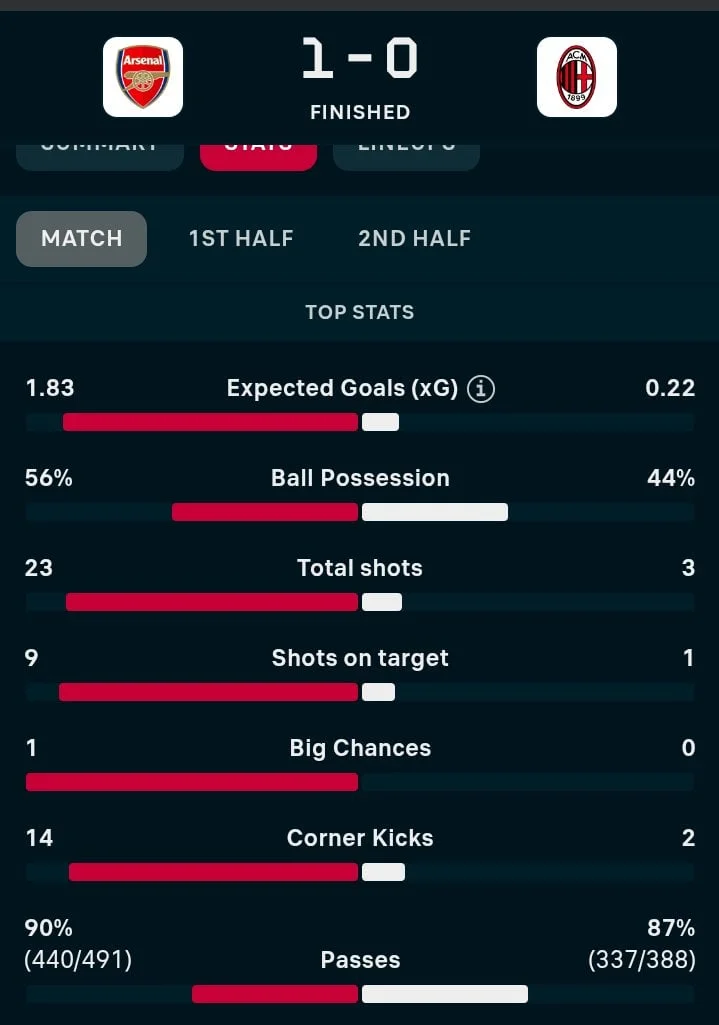 "Каноніри" по ходу гри перевершили Мілан, зумівши дев'ять разів влучити у площину воріт, а "россонері" спромоглися лише один раз.