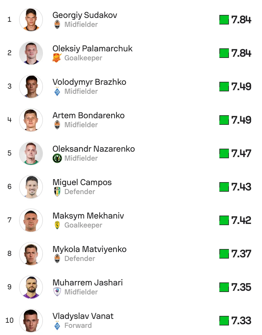 Портал Sofascore опублікував рейтинг найкращих гравців за підсумками перших 17 турів чемпіонату. До списку увійшли футболісти, які провели щонайменше 60% доступного ігрового часу. Найвищі оцінки отримали двоє – Георгій Судаков із Шахтаря та голкіпер Інгульця Олексій Паламарчук. Обидва мають середній бал 7,84.
