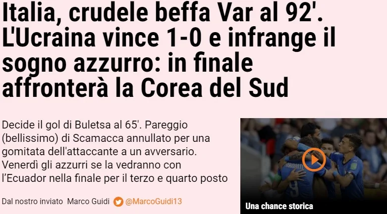 Збірна Італії не зіграє у фіналі молодіжного чемпіонату світу через скасований арбітром гол у компенсований час поєдинку. Це було схоже на невдалий жарт. Після хорошого другого тайму, з великою кількістю моментів, команда Ніколато, пропустивши на 65-й від Булеци, драматично покинула турнір.