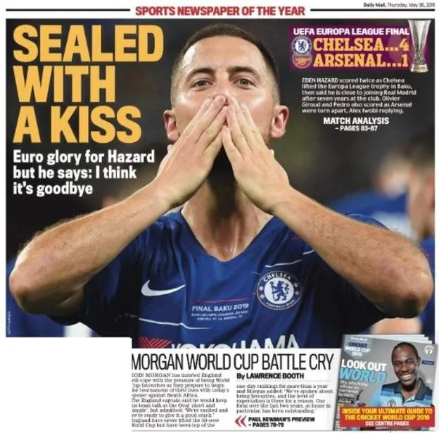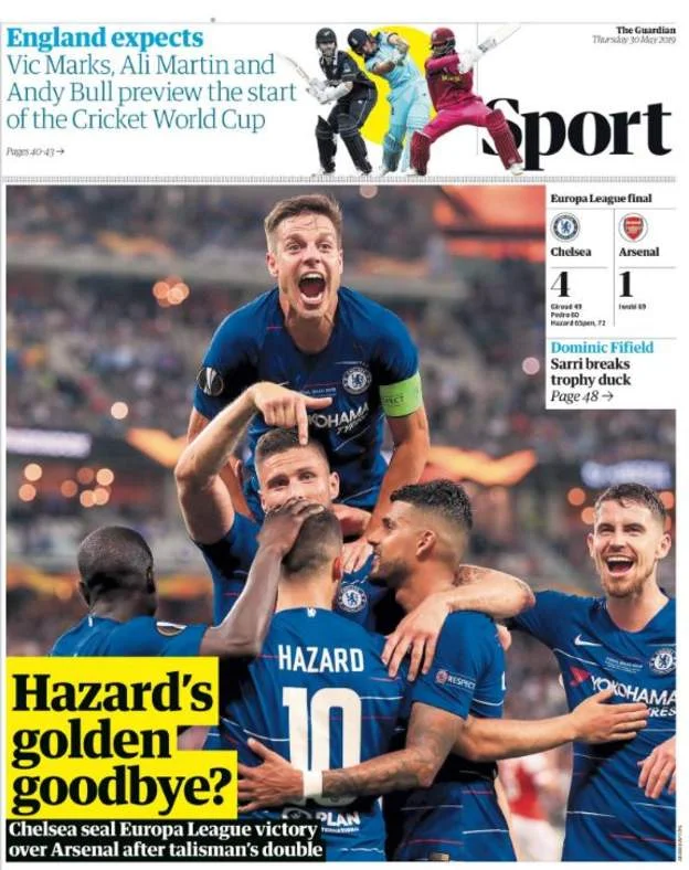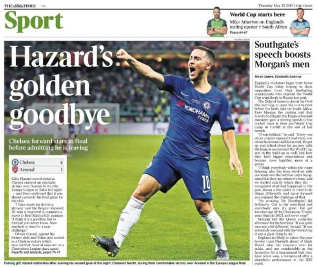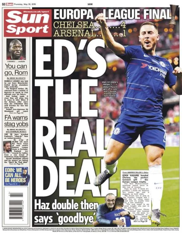 Челсі розгромив Арсенал у фіналі Ліги Європи (4:1) – Еден Азар став героєм матчу, після чого повідомив про свій ймовірний трансфер у Реал, а Мауріціо Саррі, поглядаючи в сторону Ювентуса, посоромив критиків. Реакція англійської преси – в нашому матеріалі.