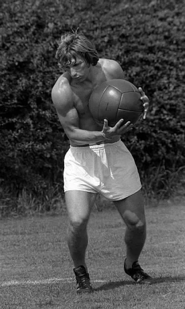 19. Захисник Колін Тодд, який у 70-х пограв за Дербі, Евертон, Бірмінгем і збірну Англії, відпрацьовує з медболом а-ля юний Шварценеггер.