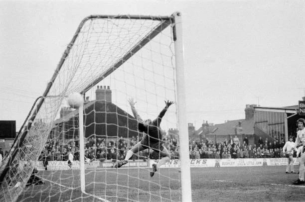 2. Грем Браун, голкіпер Менсфілд Таун, естетично пропускає від Брюса Ріоча (Астон Вілла). Квітень 1972-го.