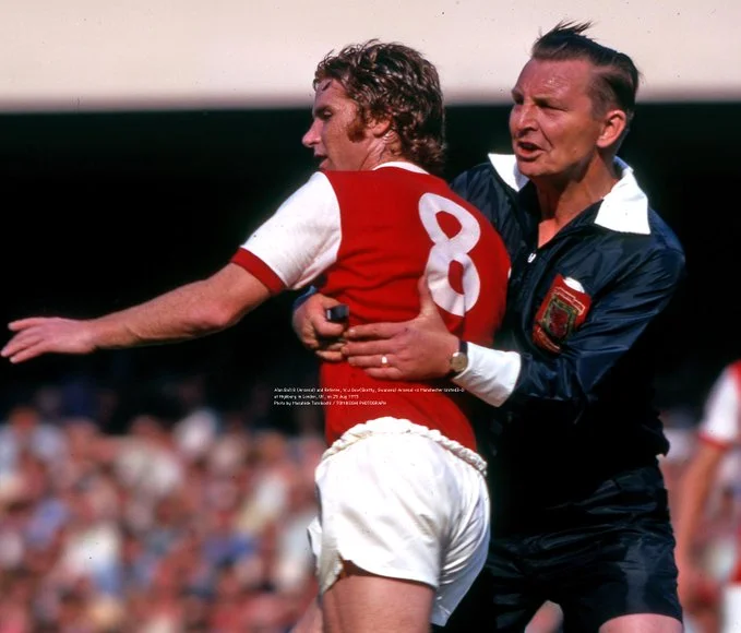 17. Головний арбітр притримує Алана Бола, півзахисника Арсенала, у матчі з МЮ. Хайбері, серпень 1973-го.
