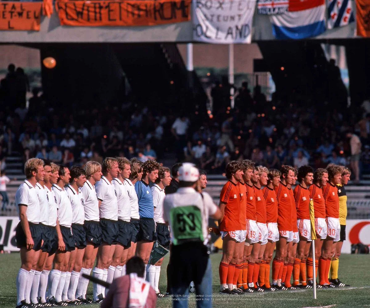 3. Євро-1980. Збірні ФРН та Нідерландів вишикувались на полі арени Сан Паоло у Неаполі перед початком шаленої перестрілки, у якій перемогу відсвяткують німці (3:2).