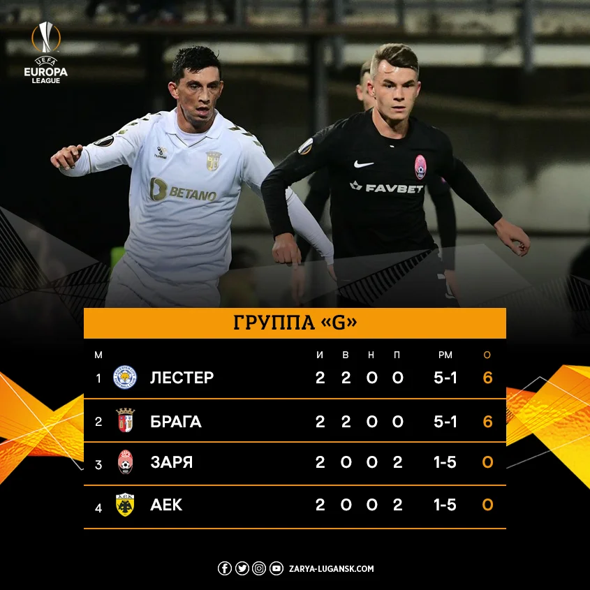 Після стартових двох турів луганці опинилися у вкрай складному становищі. Безумовно, шанси на вихід з групи ще є, але вже зараз вони видаються суто примарними. Зоря не лише програла двом фаворитам групи та відстає від них на 6 очок – тепер для кращої статистики в особистих матчах підопічні Скрипника повинні громити Лестер з різницею в 4 м'ячі. Що стосується Браги, то португальську команду слід обіграти на виїзді з різницею в 2 голи. А є ще й АЕК, який теж не планує віддавати очки команді Скрипника.