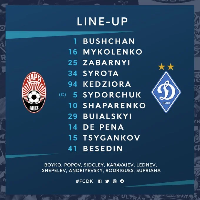 Динамо: Бущан – Кендзьора, Сирота, Забарний, Миколенко – Сидорчук, Шапаренко – Циганков, Буяльський, Де Пена – Бєсєдін