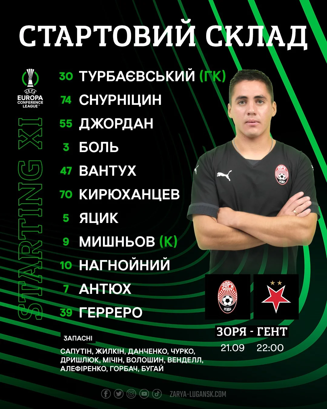 Стартові склади на матч Зоря – Гент