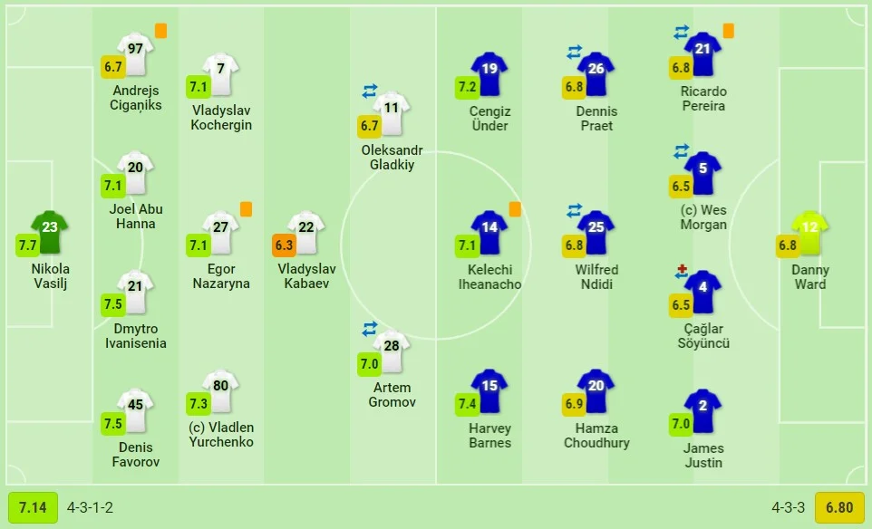 Надалі суперники почергово переходили в позиційні атаки, але із завершенням були проблеми і в тих, і в інших. Все ж Лестер діяв гостріше. Ундер накинув точно на голову Фофана, а той з кількох метрів не влучив у ворота. Іхеаначо та Маддісон потужними ударами перевірили пильність Васіля – голкіпер Зорі гідно вийшов з епізоду.