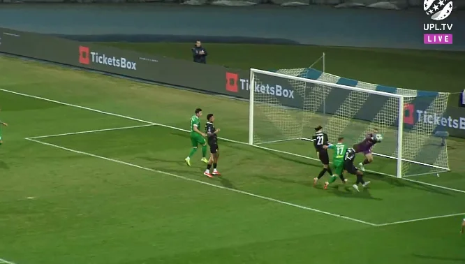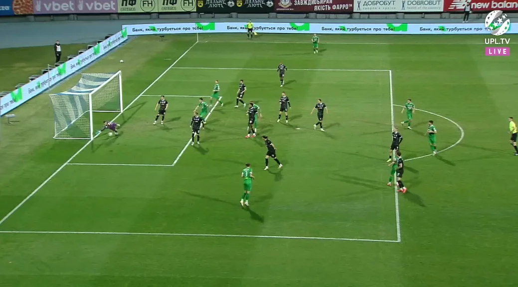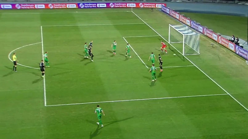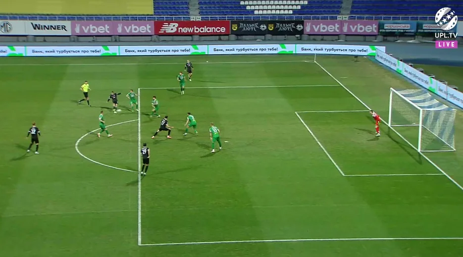Потім Стасюк підібрав винос з кутового й пробив низом у лівий нижній. М'яч рикошетом від захисника пролетів поруч зі стійкою.