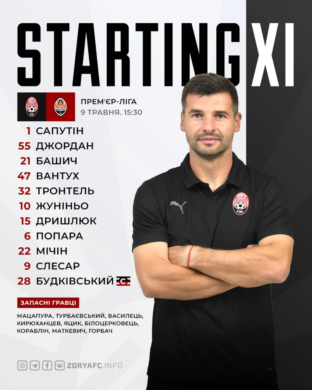 Зоря: Сапутін, Джордан, Башич, Тронтель, Жуніор, Вантух, Дришлюк, Попара, Мічін, Слесар, Будківський.