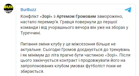 "Конфлікт Зорі з Артемом Громовим заморожено, настало перемир’я. Гравця повернули до першої команди і від учорашнього вечора він вже на зборах у Туреччині.