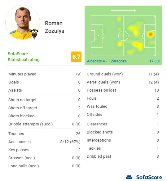 Проте непомітна робота українського форварда на команду, безумовно, полегшувала Альбасете справу. FootballCritic гірше (5,5, середня оцінка Романа 5,8) оцінив тільки 4-х футболістів Сарагоси. SofaScore виписав йому 9-й бал серед усіх гравців (6,7), що також нижче середнього по сезону (6,9). Водночас ніхто не вступав у повітряні дуелі частіше за вихованця Динамо (12, виграв 4, а це вже третій результат). Тільки єдина світла пляма гостей Бургі (10 з 15 успішно) частіше брав участь у єдиноборствах (11, виграв 4 дуелі). Зозуля поступився лишень партнеру Чемі (4) за кількістю створених для партнерів моментів (2).