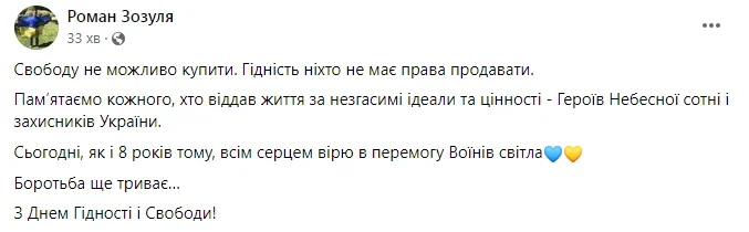 Зозуля привітав українців з Днем Гідності та Свободи: "Пам’ятаємо кожного, хто віддав життя за незгасимі ідеали"