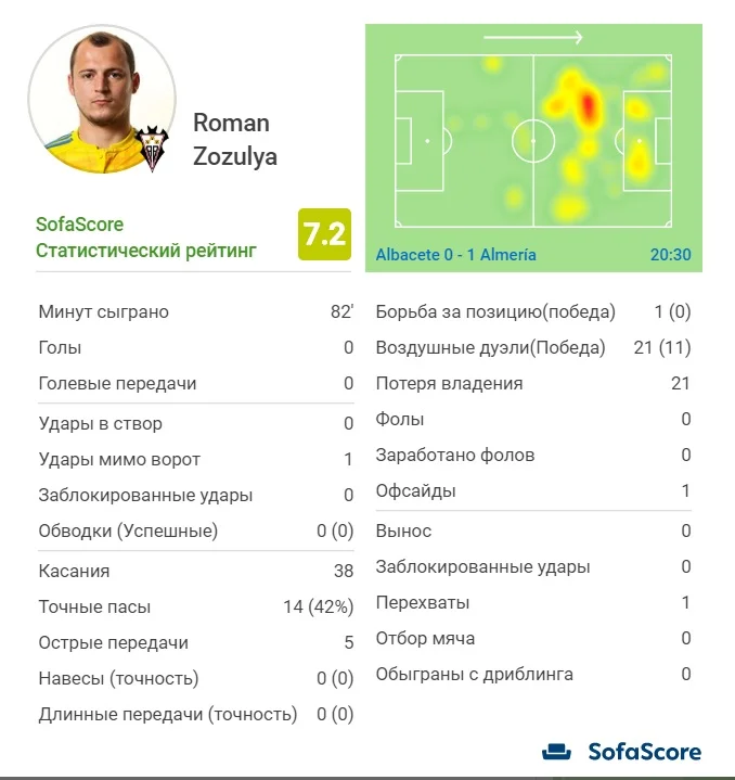 На 82-й хвилині Лукас Алькарас замінив Романа Зозулю. Український нападник продовжив свою безгольову серію, хоча отримав високу оцінку від Sofa Score. 7,2 – другий найкращий бал у складі "механічного сиру". Зауважимо, що саме Зозуля віддав найбільше гострих передач серед усіх гравців Альбасете (5). Господарі відрізками демонстрували пристойну гру, але вкотре не реалізували свої моменти, підтвердивши сумне реноме найгіршої атаки Сегунди.